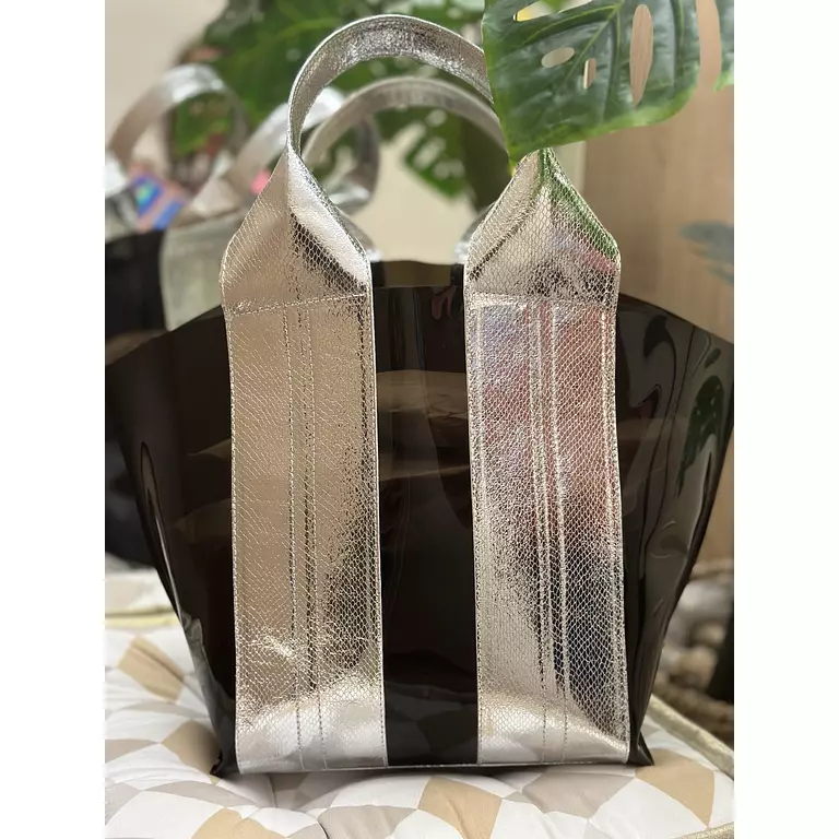 Our plastic Club Silver Tote Bag is both stylish and practical with good storage space that will support you throughout an entire day on the beach, Pool & City!